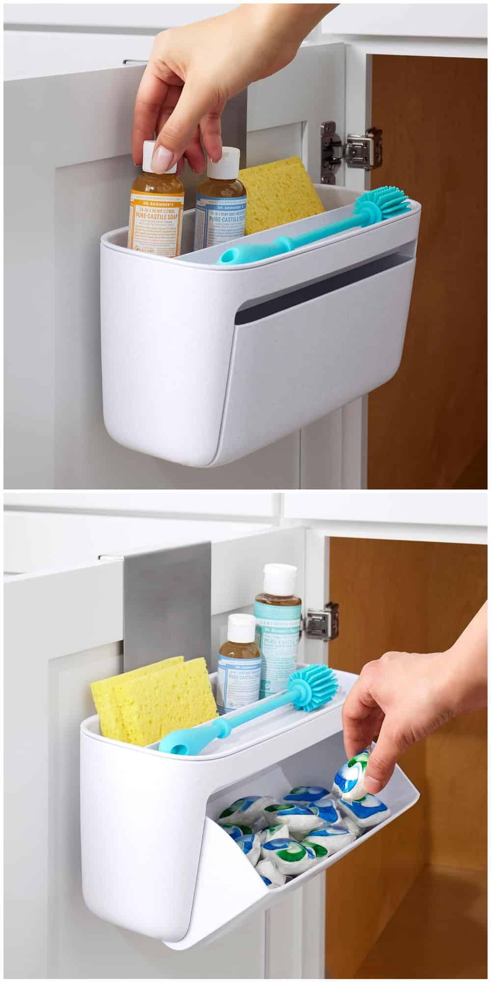 Finally – no more bulky pod boxes under your sink. This clever bin hangs on the inside of your cabinet door and dispenses pods like magic.