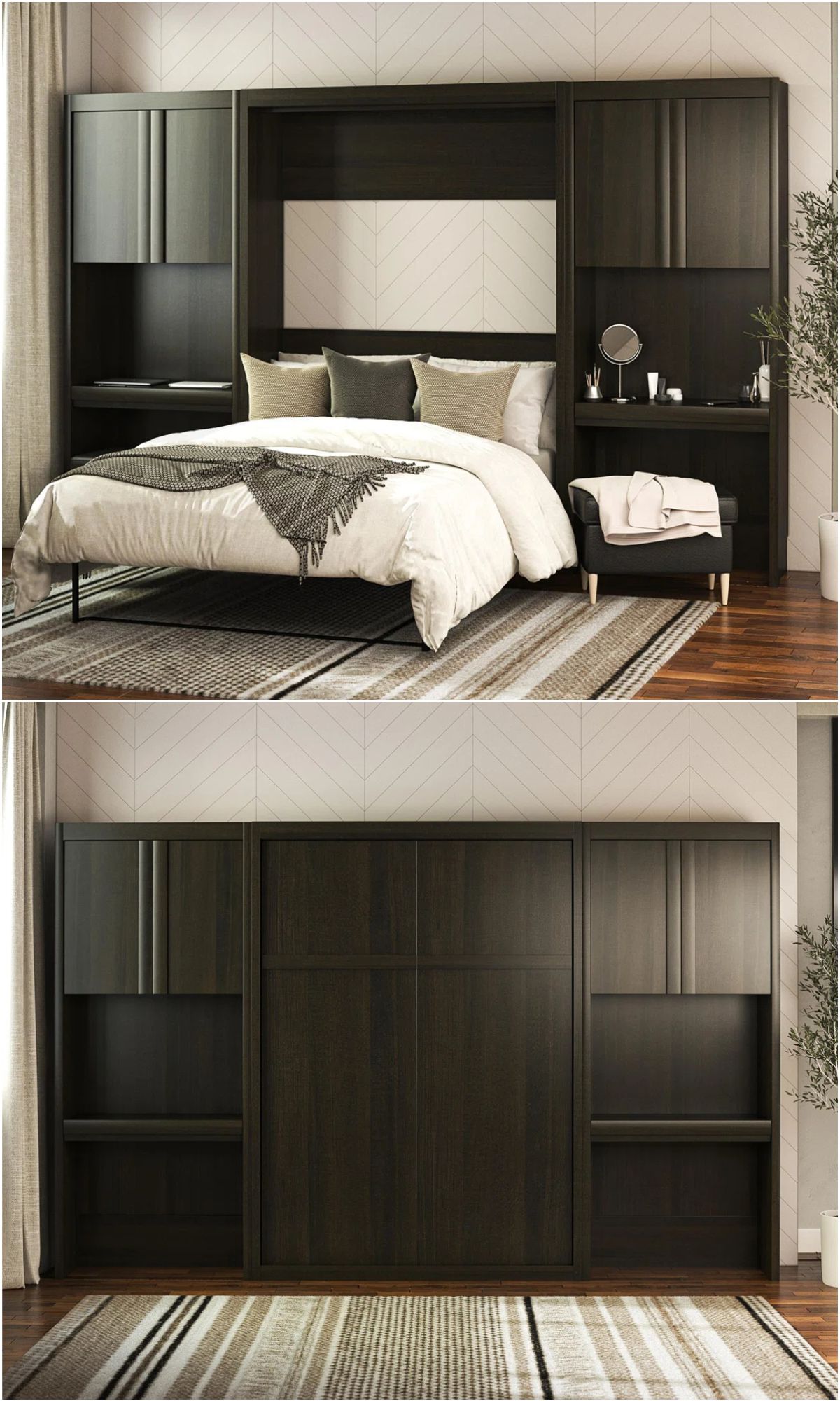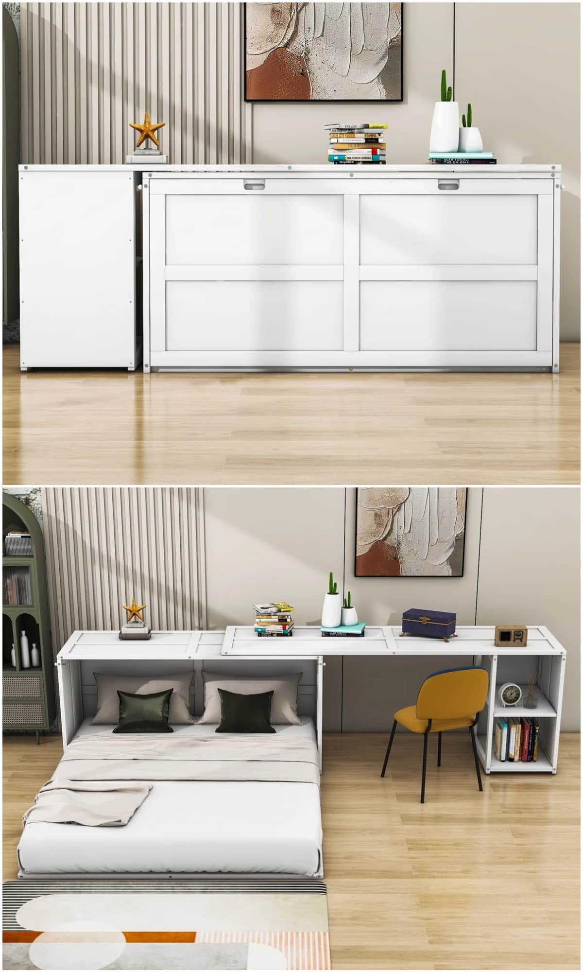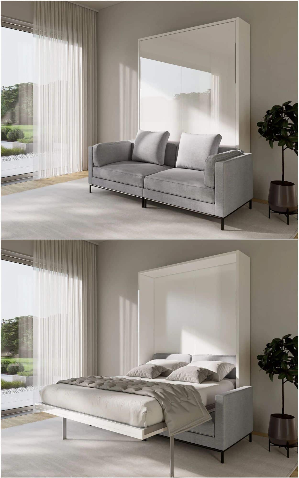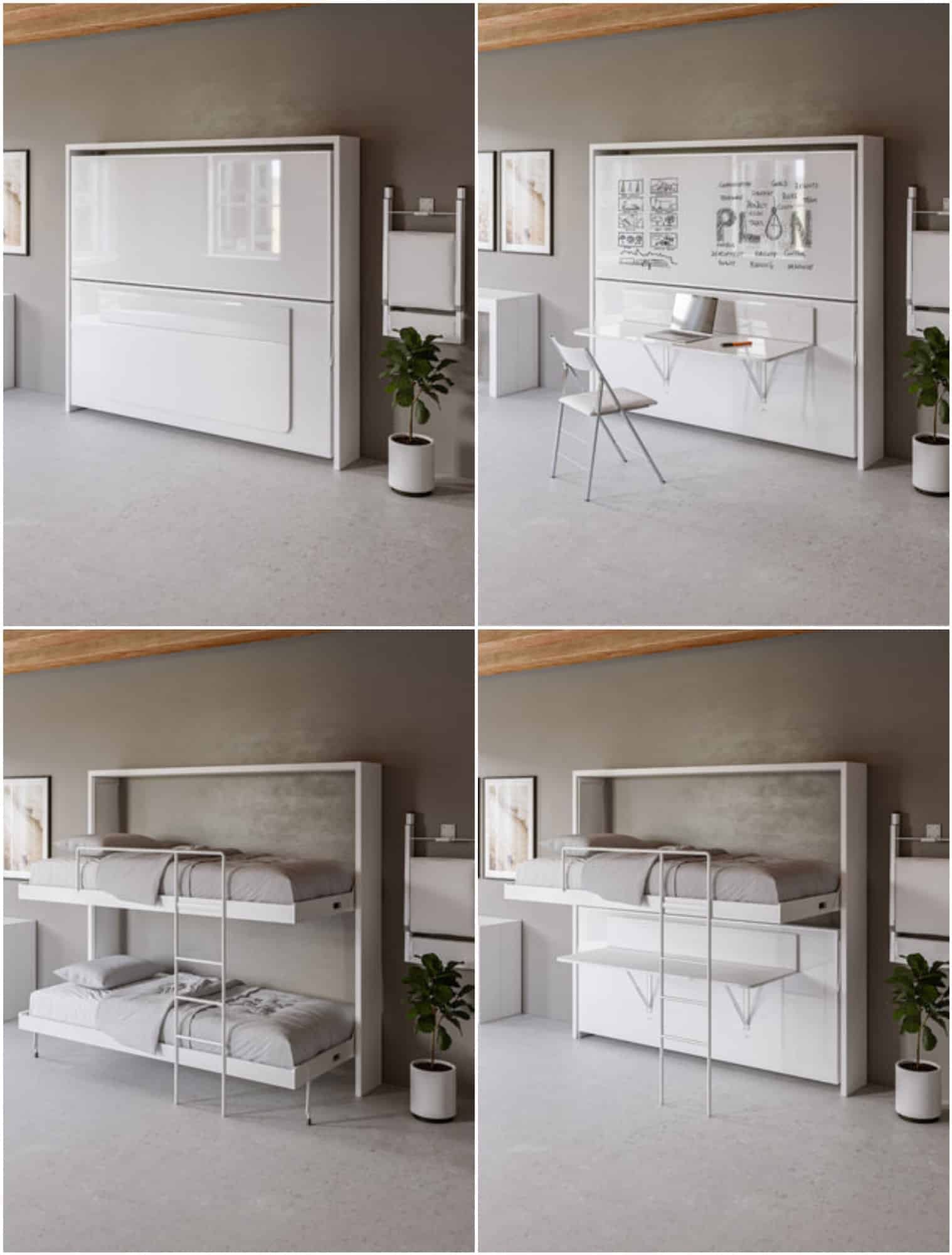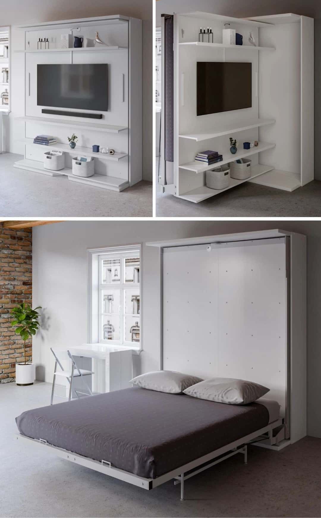 Below, you’ll find a carefully curated mix of Murphy beds that go far beyond the basics. From library-style wallbeds and rotating bookcases to bunk systems, desks, wardrobes, sofas, and hotel-worthy table setups, these designs are built for real life in small spaces. Some are investment pieces, others are surprisingly affordable—but all of them prove that multifunctional furniture can be both practical and genuinely good-looking.