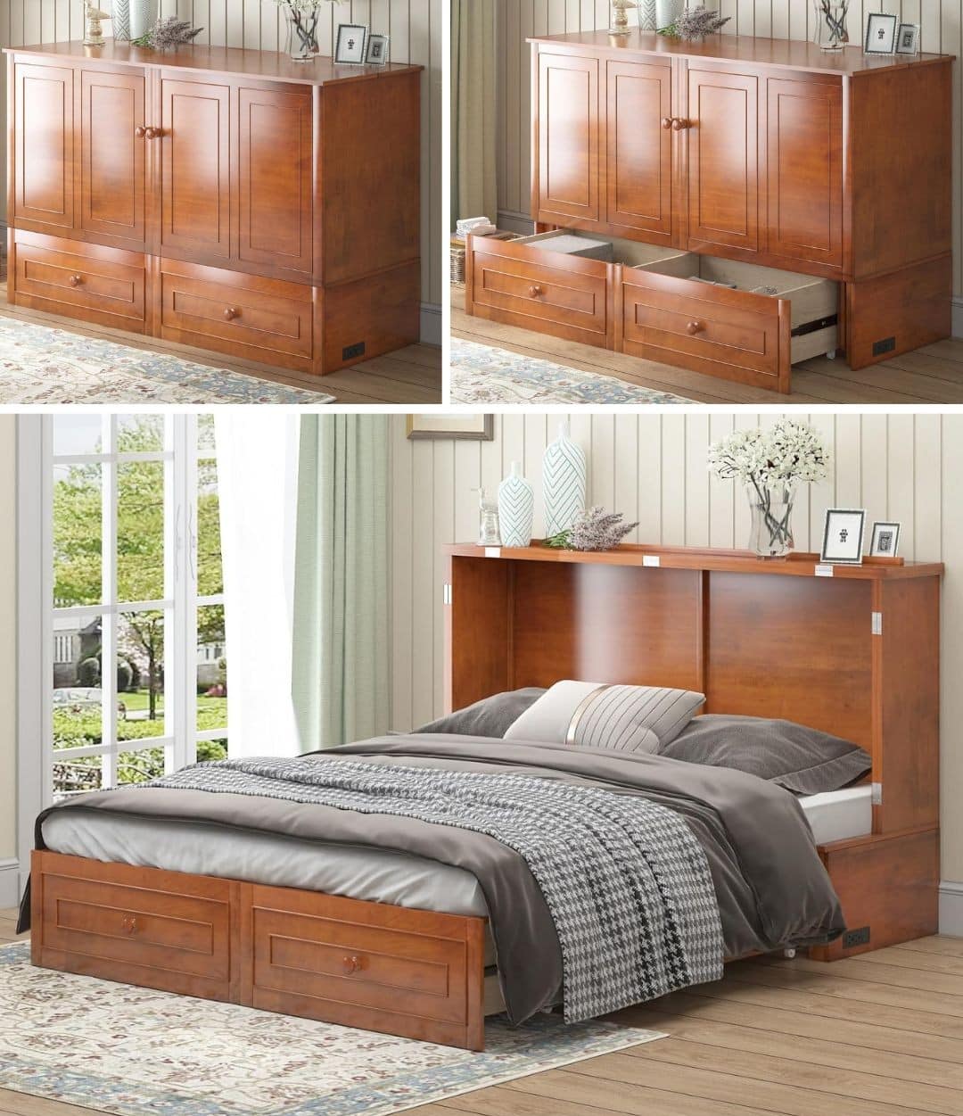 This chest-style Murphy bed is ideal for renters or anyone who wants flexibility without wall mounting. It opens to reveal a tri-fold gel memory foam mattress and includes thoughtful extras like built-in USB and AC ports, a storage drawer, and a small fold-out tray table. Made from solid rubberwood and designed to support up to 600 pounds, it’s sturdy enough for everyday use while still compact enough to work in apartments and guest rooms.
