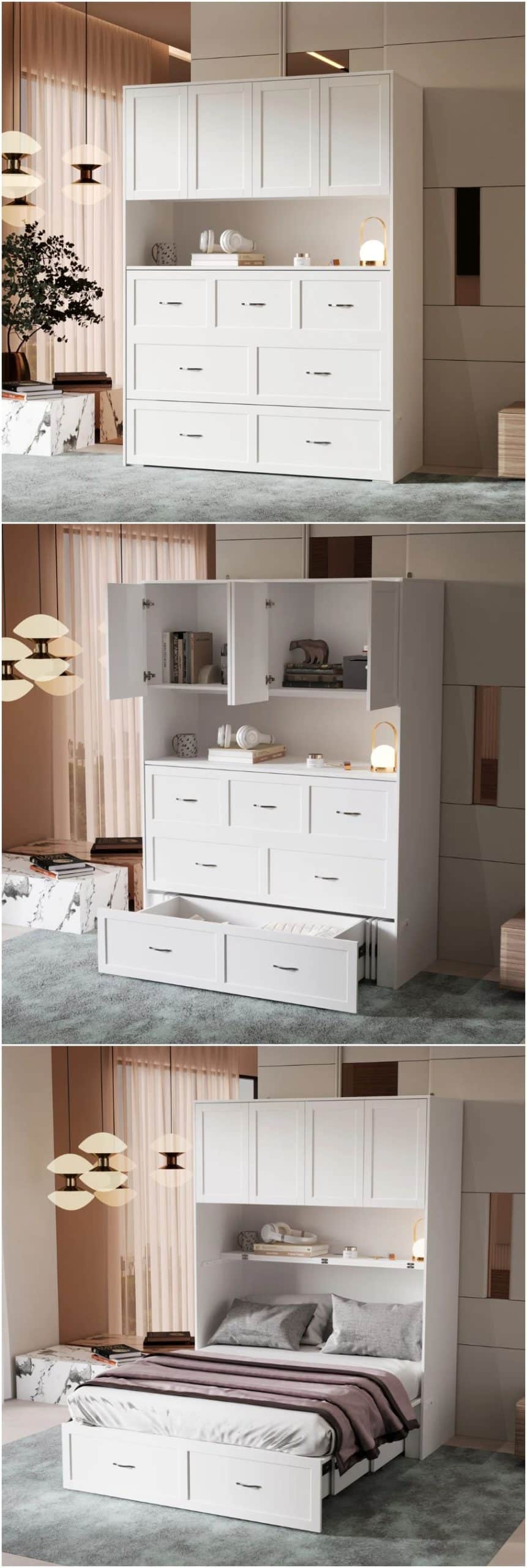 This Murphy bed feels tailor-made for modern apartment living, where every outlet and storage inch matters. When closed, it functions as a clean-lined storage cabinet with upper cupboards and drawers for clothes, linens, or office supplies. When opened, it reveals a full-size bed—plus built-in AC outlets and USB ports so charging your phone doesn’t require furniture gymnastics. Smooth sliding tracks and concealed wheels make it easy to operate, while the safety lock keeps everything secure. For the price, it’s a remarkably efficient solution for studios and guest rooms alike.