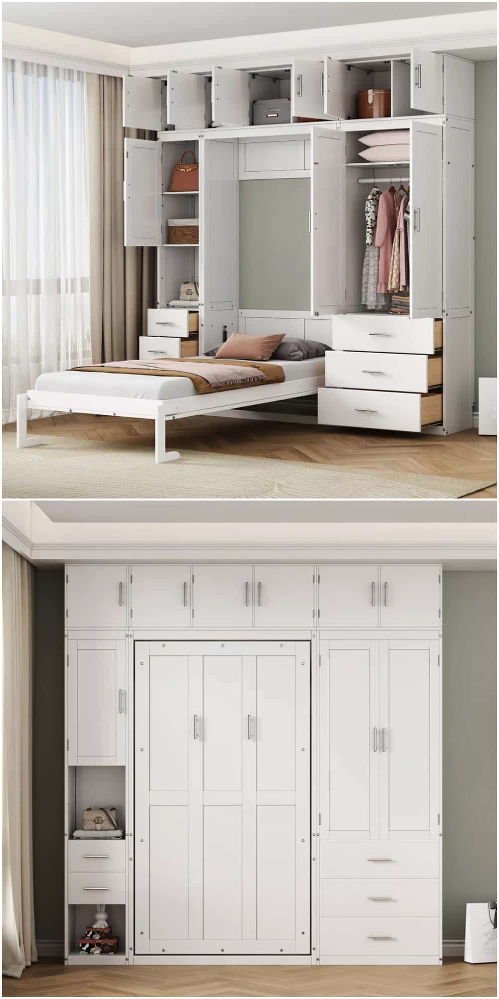This Murphy bed takes storage seriously. When folded up, it becomes a full cabinetry system with shelves, drawers, and wardrobe-style compartments on both sides—ideal for organizing everything from clothes to books to everyday clutter. Built from solid pine with a secure folding mechanism that keeps bedding in place, it’s designed for regular use rather than occasional sleepovers. The clean, cabinet-style exterior works well in minimalist or modern interiors, making it a strong option for kids’ rooms, studios, or compact guest spaces.