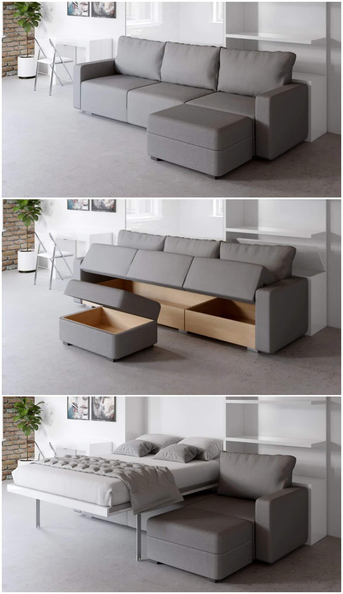 Every component pulls its weight here: the main sofa, chaise, and ottoman all include hidden storage, and the chaise is fully reversible, adapting to different room layouts. Matching glossy white side shelving with a storage box adds built-in function without visual clutter. Designed to North American mattress sizes but built in Europe, this is a true living-room-first Murphy bed—ideal for apartments where your lounge needs to become a bedroom without looking like one the rest of the day.