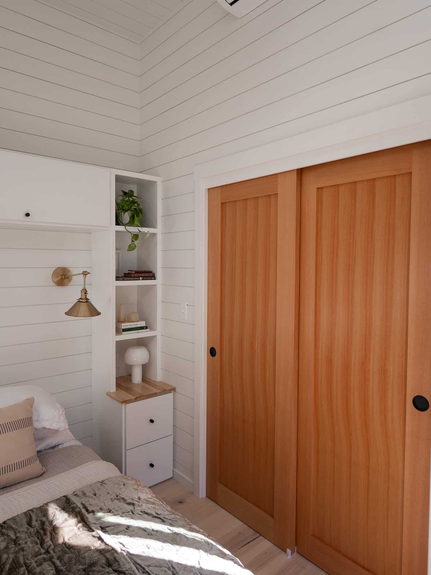 The primary bedroom certainly isn’t lacking space or storage, with room for a king-sized mattress and a custom-built headboard. The headboard boasts open shelving and storage and blends into the wall.