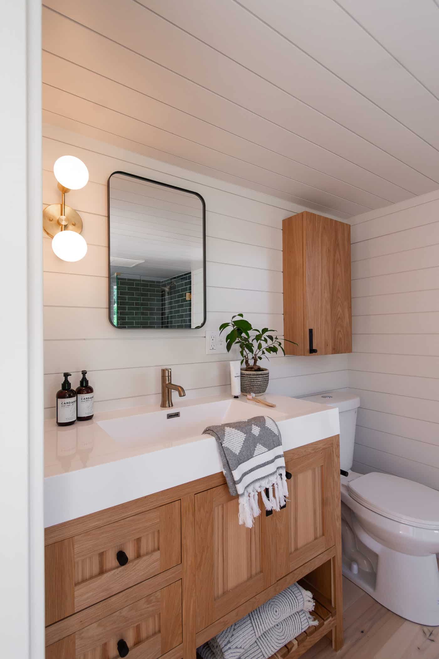 The bathroom is an elegant space with champagne bronze Delta Trinsic fixtures and luxe finishes. It also has a matching hickory wood medicine cabinet and an all-in-one vanity with hidden storage, both built by hand in-house by the Tru Form Tiny team.