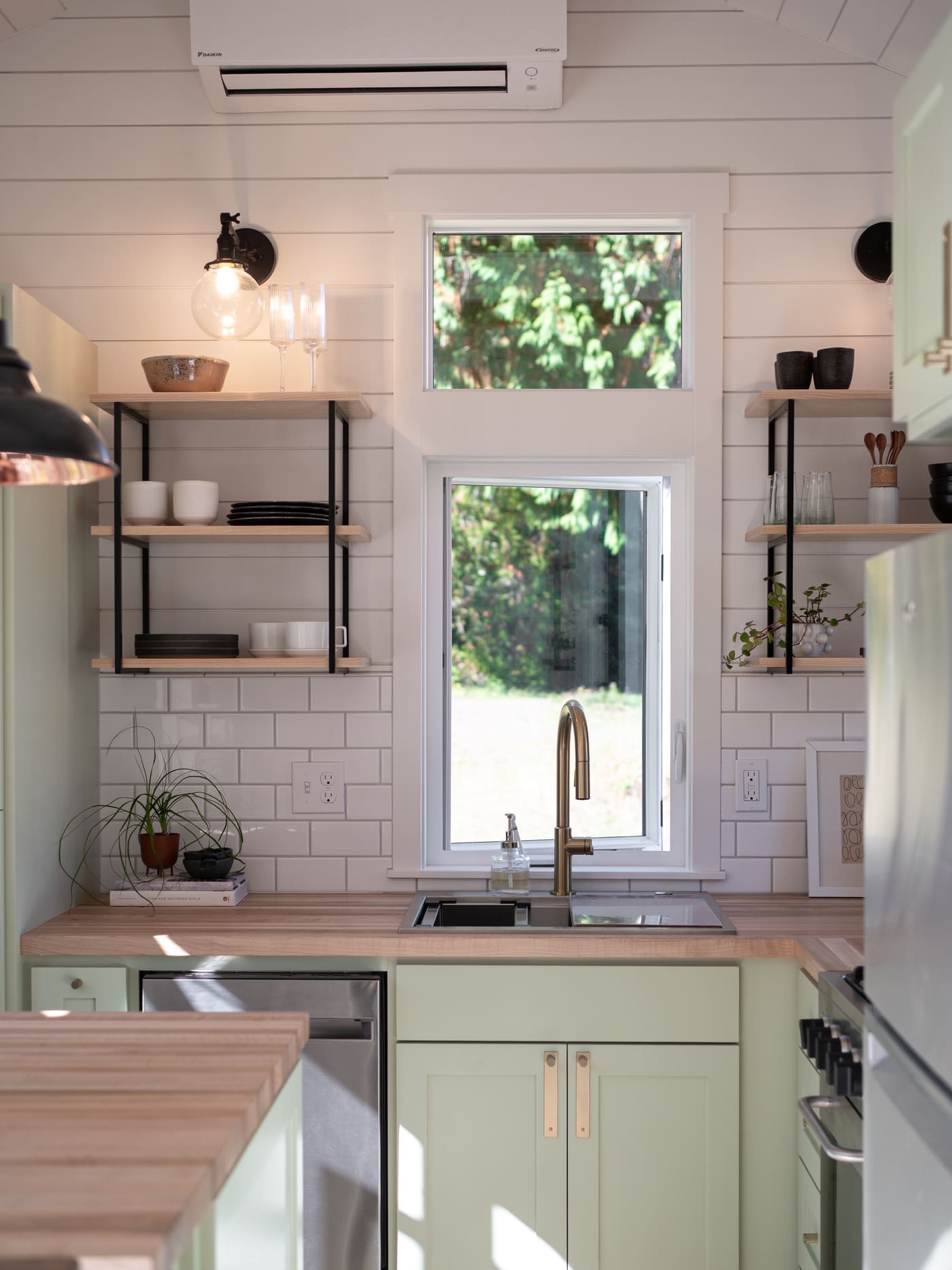Storage is certainly not lacking in this tiny home’s kitchen, with both closed cabinetry and open shelves. Two opening windows also drench the area in sunlight.
