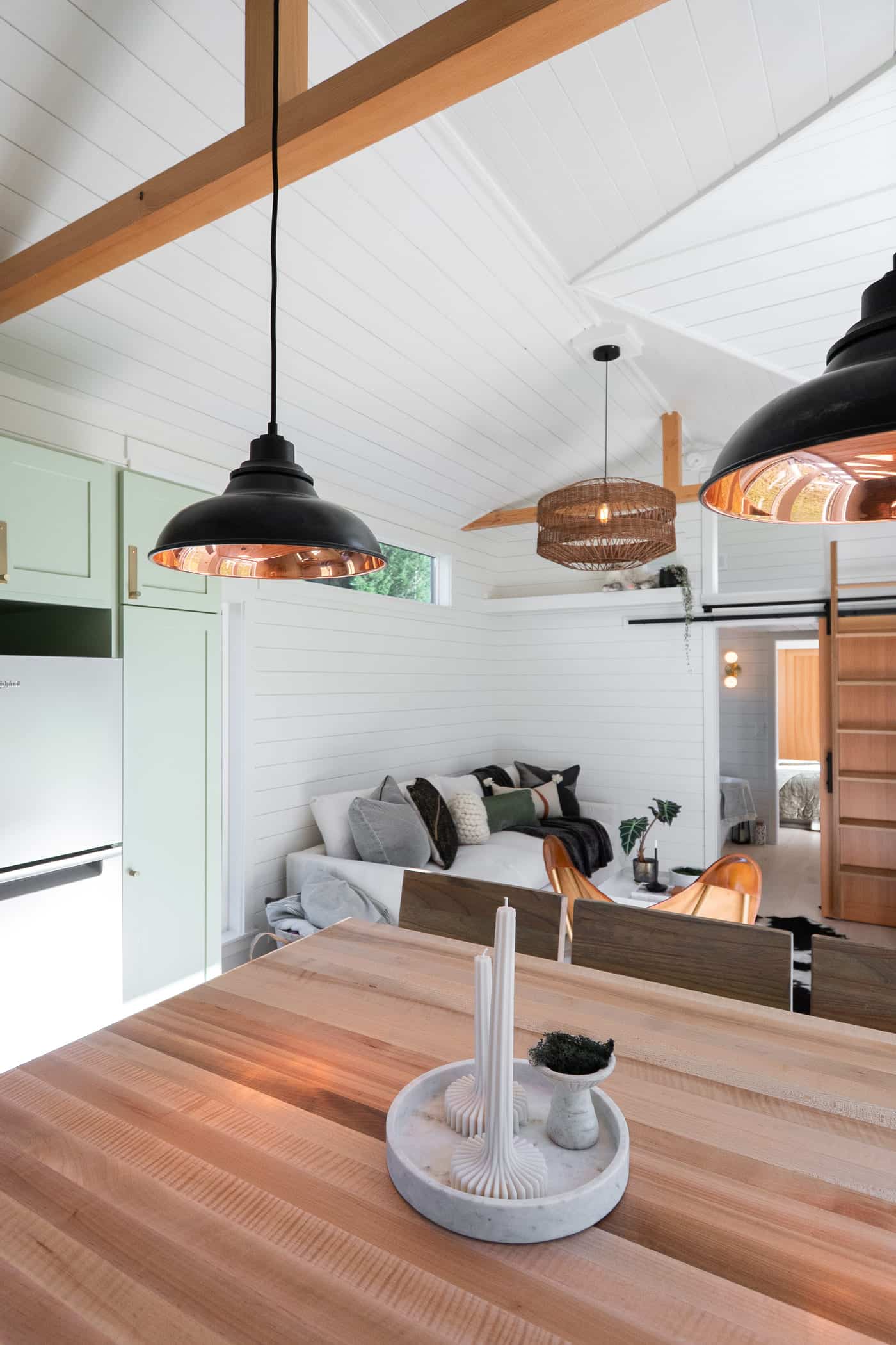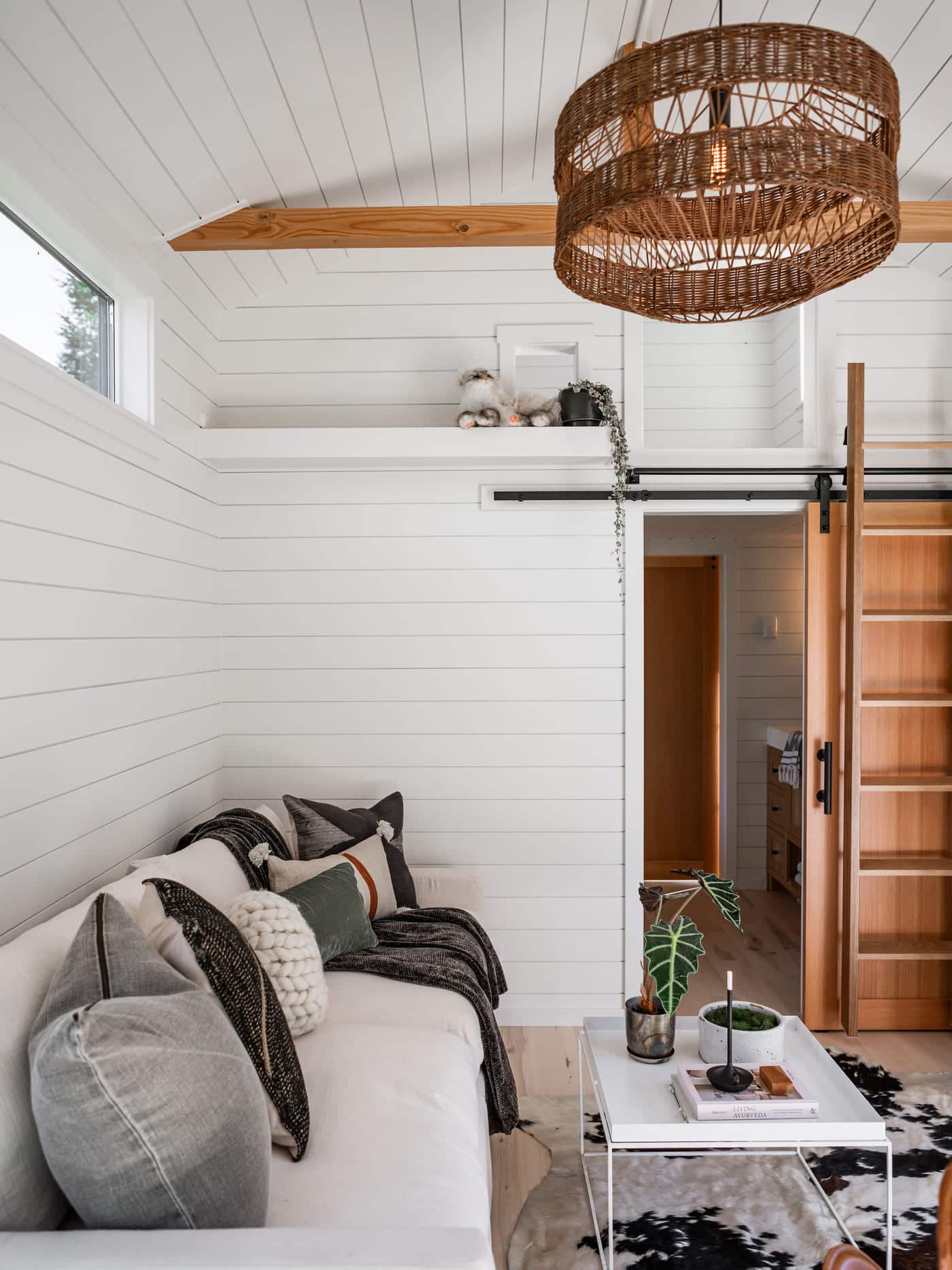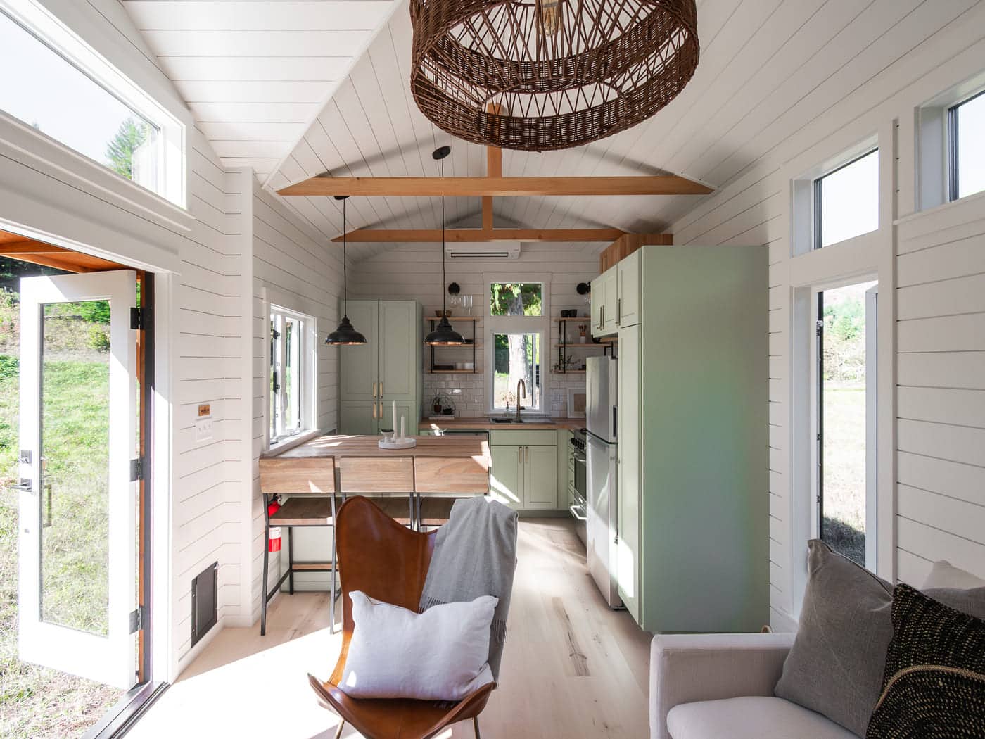 Indoors, the tiny home is light and airy with fresh white walls and an abundance of windows for natural light.