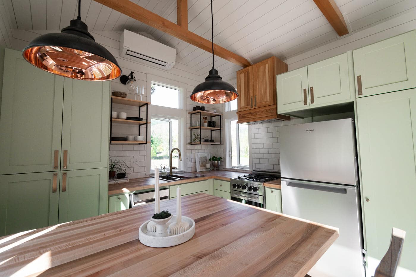 This tiny home allows for comfortable everyday living with an open kitchen and living space. Furniture has been cleverly positioned to create a clear distinction between the areas. The gorgeous green kitchen cabinetry breaks up the white walls while defining the kitchen. Tru Form Tiny installed Manhattan Maple engineered hardwood floors throughout the tiny home to complete the look.