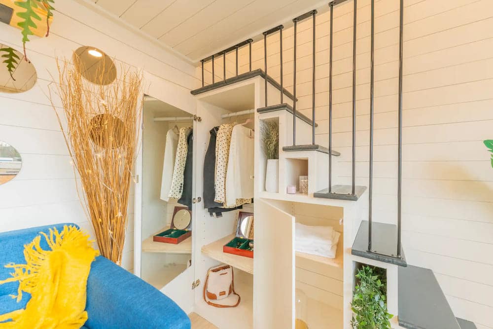 The true highlight of the living area is a set of stairs leading up to the main bedroom loft. There’s more to this storage solution than meets the eye. The stairs boast a hanging rod for clothes, four adjustable shelves, and doors to keep visible clutter to a minimum. There’s even a hidden mirror for easy fit checks!