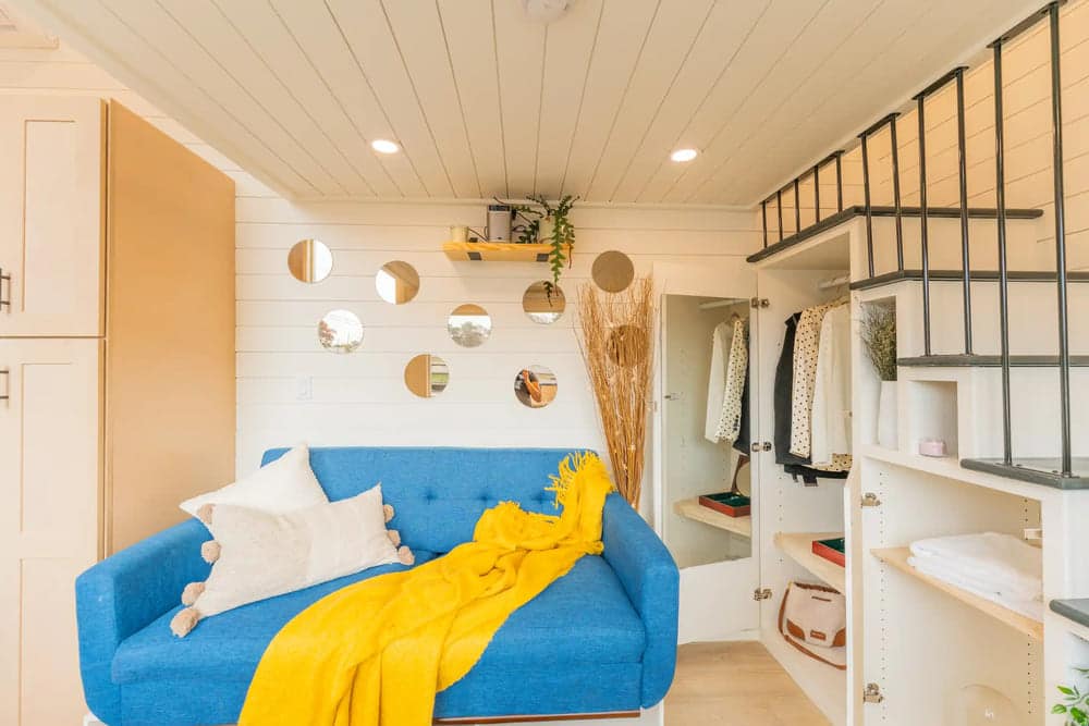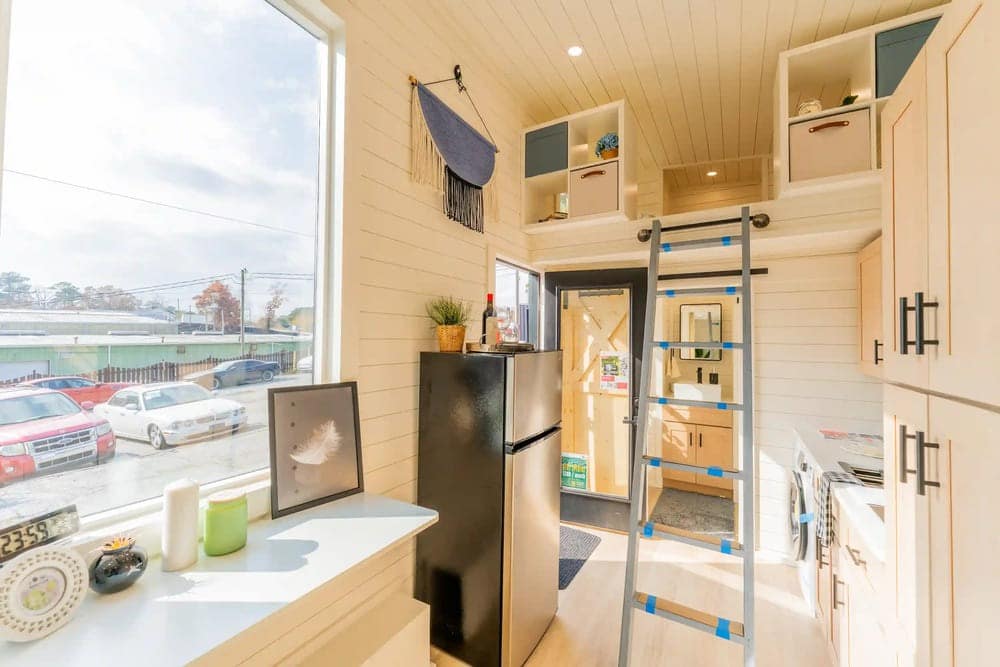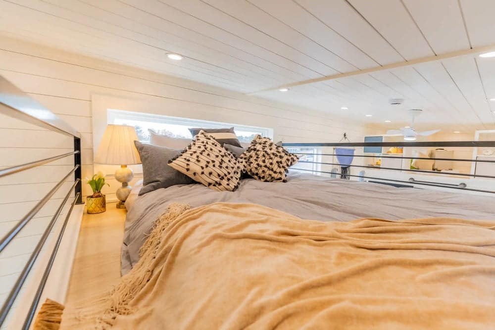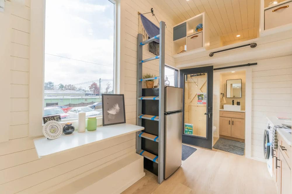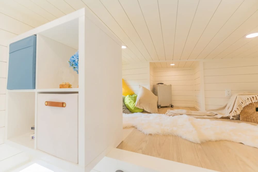 While many tiny homes in this price bracket only have one loft bedroom, this one has two. This secondary loft can fit a full-size or twin-size bed and features storage on both sides with built-in cubbies. There is also a vanity bumpout to create even more storage space.