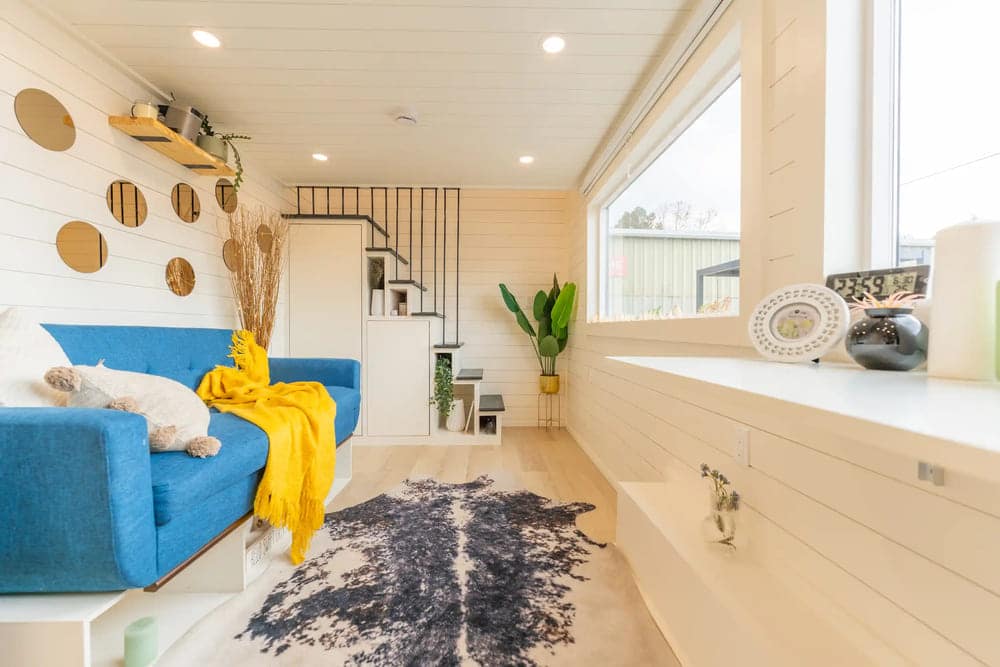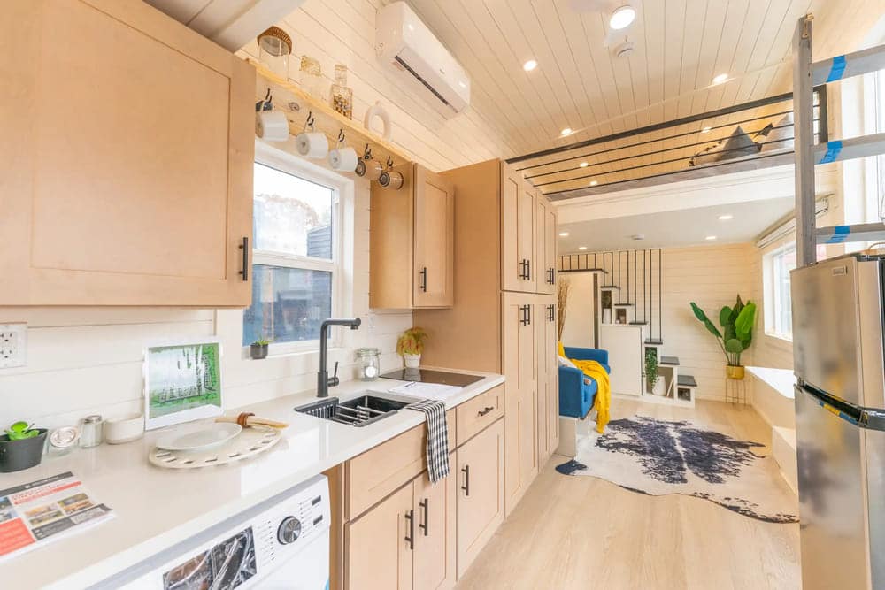 It’s eight feet, six inches wide, 24 feet long, and 13 feet, six inches tall to accommodate the two spacious lofts. This practical and stylish tiny home is also move-in ready with a kitchen featuring a washer-dryer combo, a living area, and a bathroom.