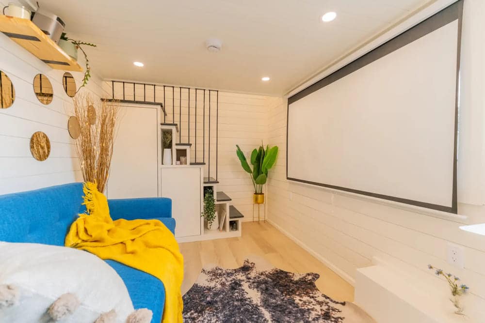When you need something fun to do on a lazy Sunday afternoon, get comfortable and watch a movie. Rather than installing a light-blocking TV cabinet, Dragon Tiny Homes ran projector wiring and installed a pull-down projector screen.