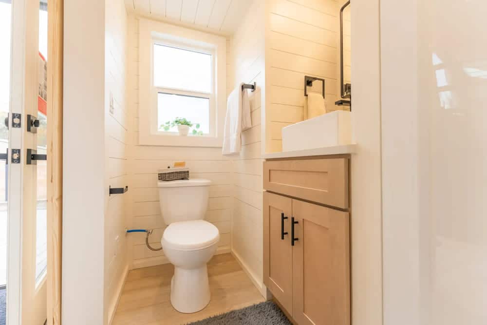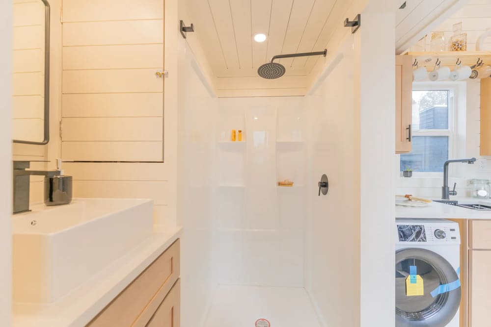 Dragon Tiny Homes understood how important a functional, spacious bathroom is in a home of any size. So, they undoubtedly delivered in this quaint 24-foot tiny home. The bathroom is at the rear, with a 36-inch shower featuring contemporary black hardware, a toilet, and high-quality finishes throughout. There is also no shortage of storage. You’ll surely get use of the medicine cabinet, washcloth rack, towel racks, and a quartz vanity with soft-close cabinets and drawers.