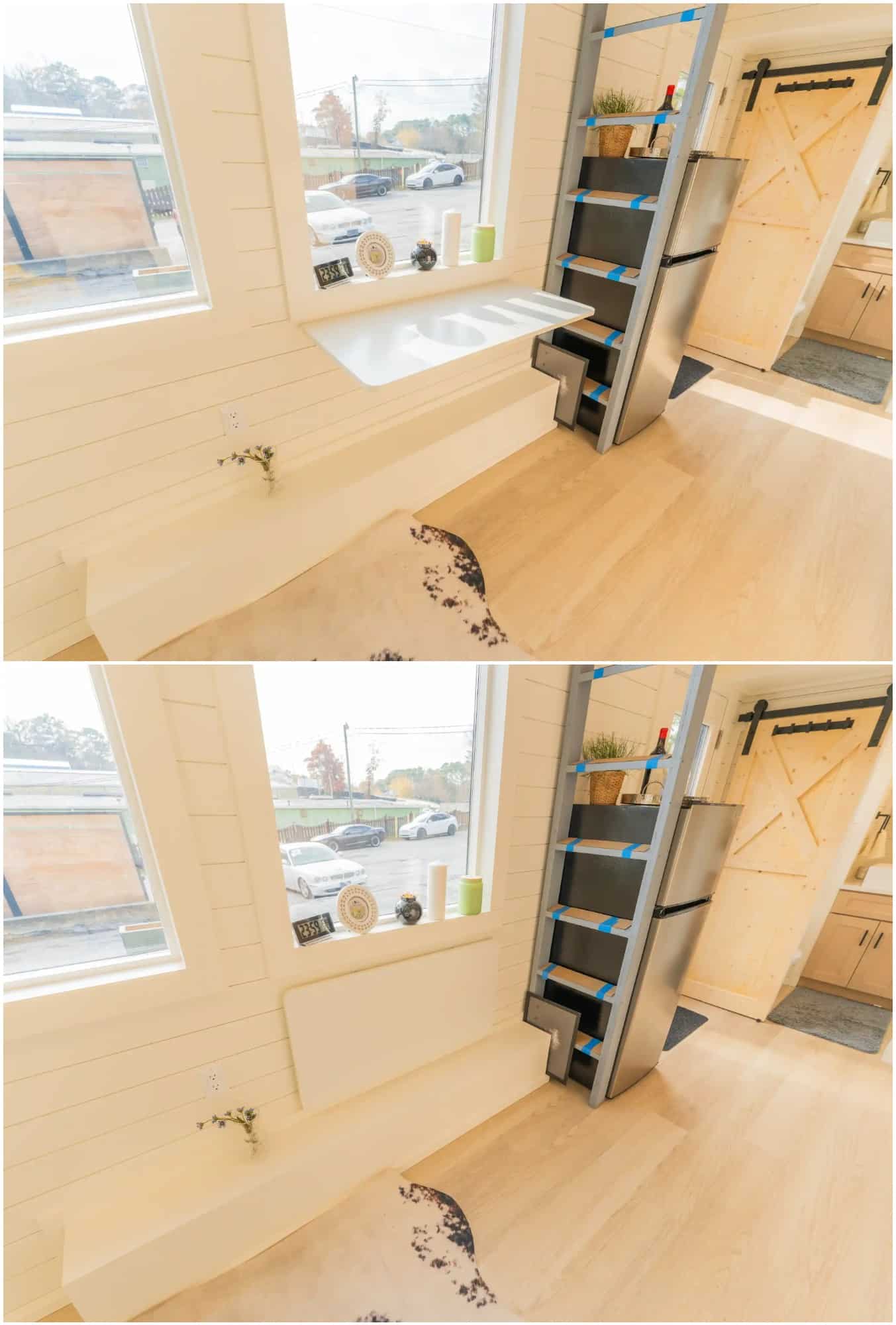 Vista is all about practicality and versatility. Between the kitchen and living area is a gorgeous collapsible wood table with a quartz wall mount. Tucked away between the fridge and table is the ladder. This provides access to the second loft above the bathroom at the rear of the tiny home.