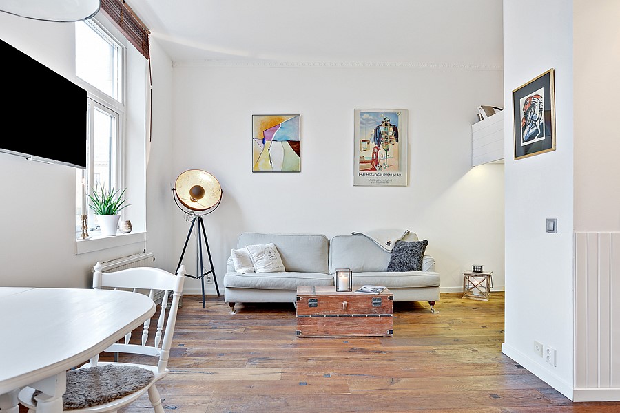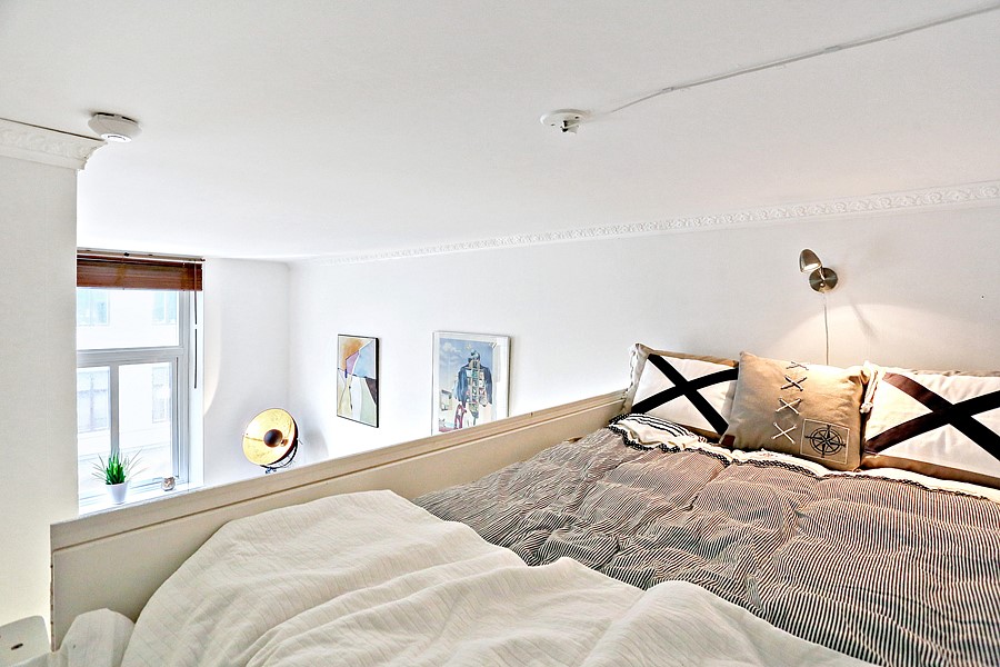 Measuring 30 sq. meters/323 sq feet, this studio apartment in Gothenburg, Sweden uses a neutral colour palette and an abundance of storage to look triple its size. Warm rich floors give the room an open feel while a raised loft bedroom area makes sure no space goes unused. Minimal decorations help the homeowner keep the space open, and two large windows give the whole apartment plenty of natural light.