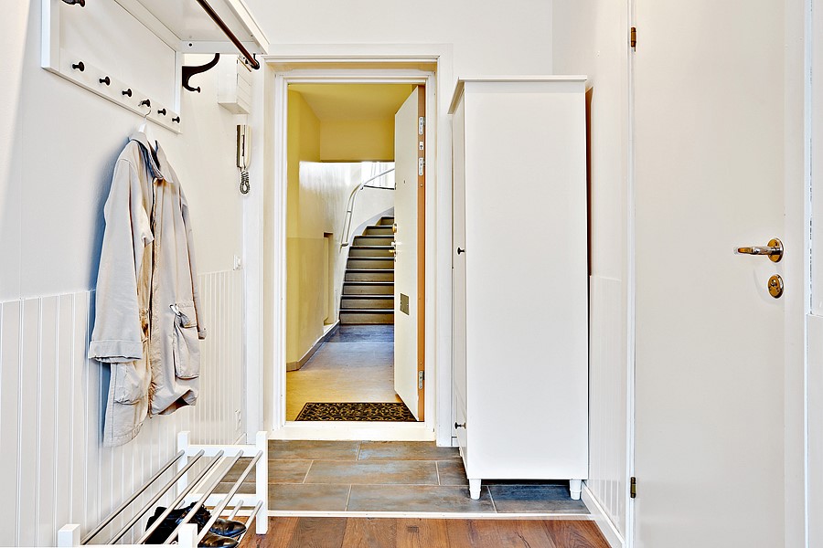 A dark brown tile flows into a rich warm wood welcoming you into the space. On the walls sit a large cabinet for gloves, hats and other outdoor accessories, while a set of hooks hold coats. A shoe rack holds boots and other footwear.