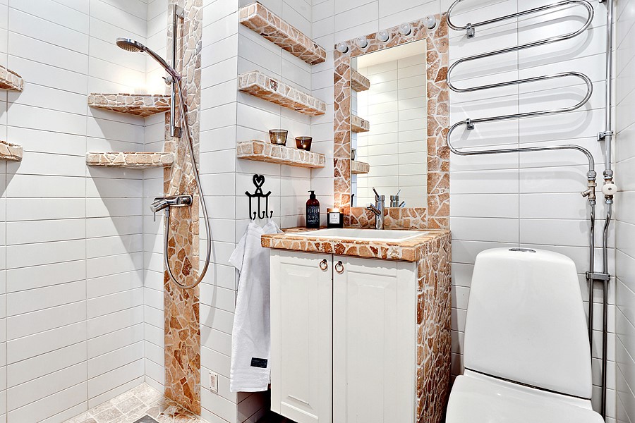 Brown tile in a mosaic pattern outline the shower, its shelves, and the adjacent vanity. The rest of the room is tiled in bright white, making it look clean while adding an attractive element. The wall-mounted showerhead is an efficient use of the space, and the wall-mounted shelves provide plenty of room for shampoo, soaps, and other items. A small but efficient vanity holds a deep sink.