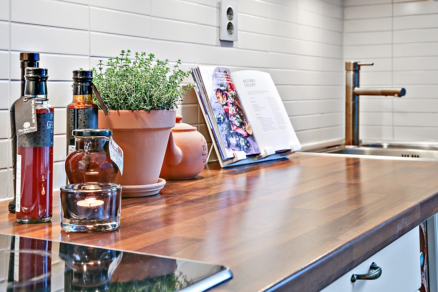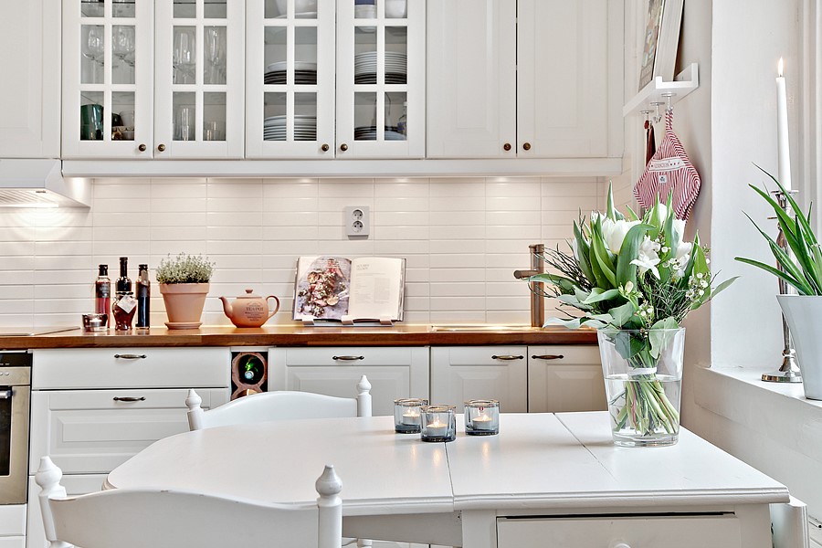Square white subway tile forms an attractive backsplash in the kitchen area. The cabinetry features more than 10 spaces where all of the kitchen needs are stored easily, while the white dishes are viewable in the glass-front cabinets. Hardware is minimal with silver accents, while a butcher block countertop gives space for plants, vinegars and oils, and food prep.