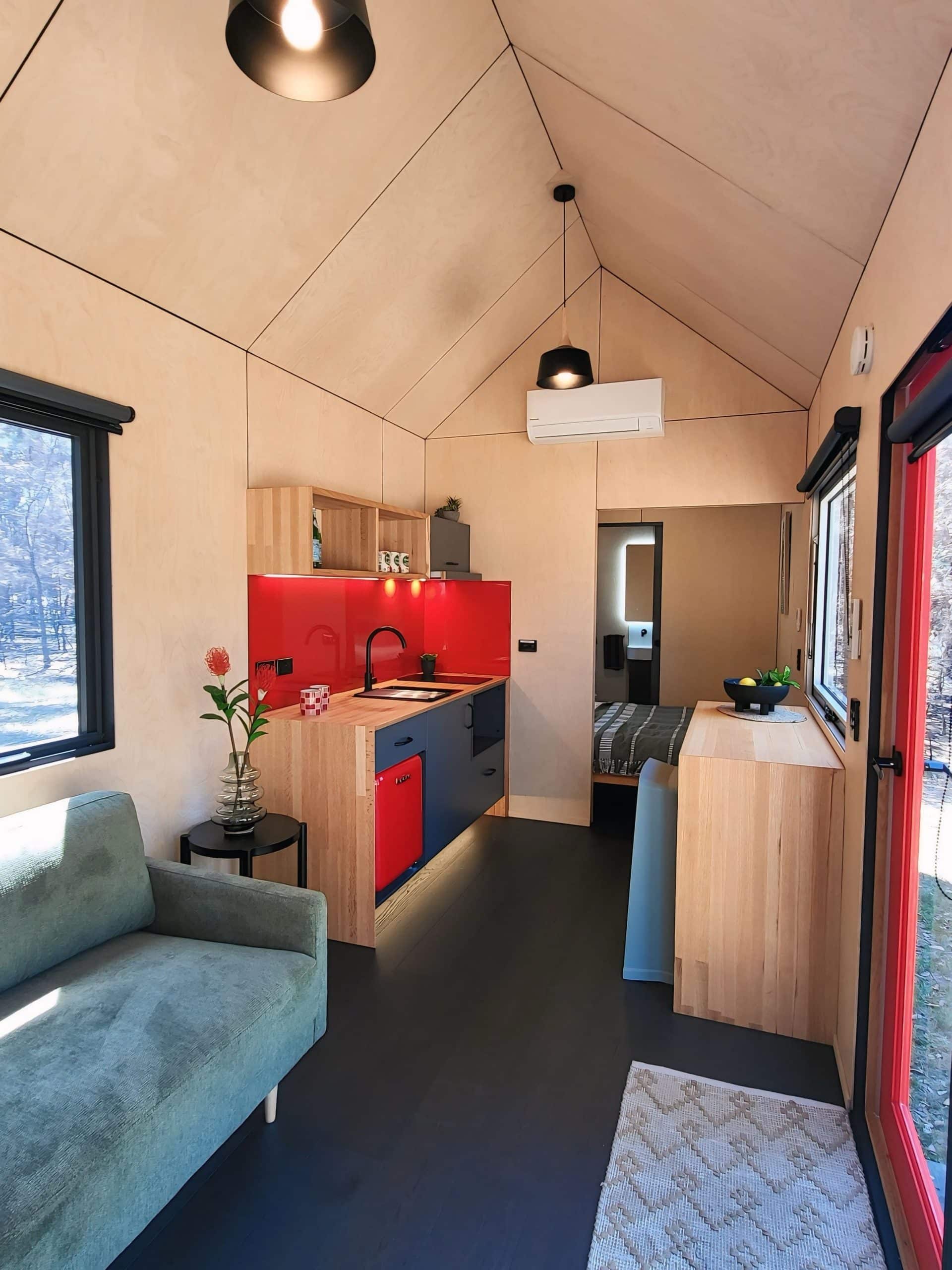 The contemporary elegance of this tiny home becomes evident when you walk inside. All internal walls are lined with premium birch plywood with a beautiful light whitewash. There is also a timber-framed single front door to let in plenty of natural light, alongside the large window.