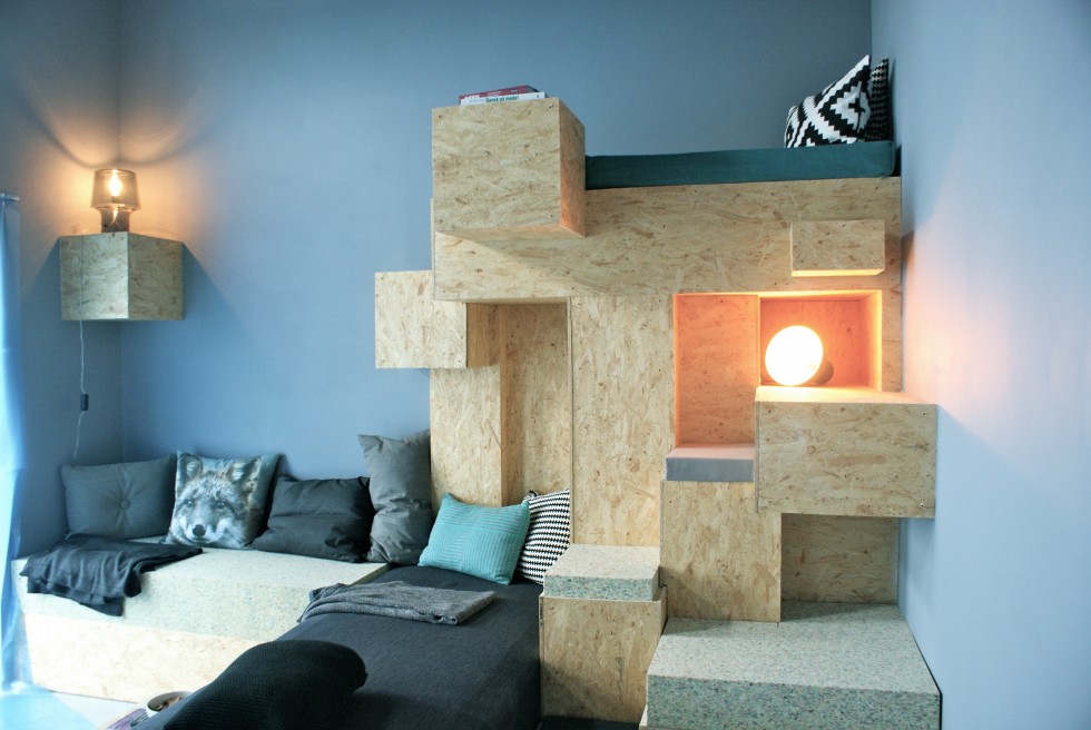 The loft bed that’s made out of scaffolding tubes gives the room a raw industrial feel