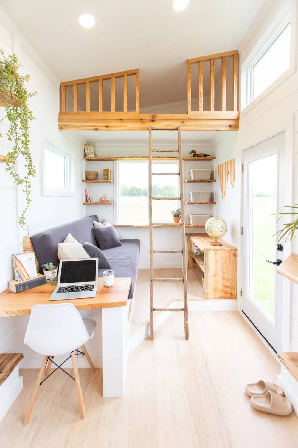 The light, bright, and fresh interior is the epitome of modern and inviting. The white shiplap walls and birch accents add much-needed lightness to the space. In contrast, the engineered, waterproof vinyl plank oak tongue-and-groove flooring throughout the living space provides warmth.