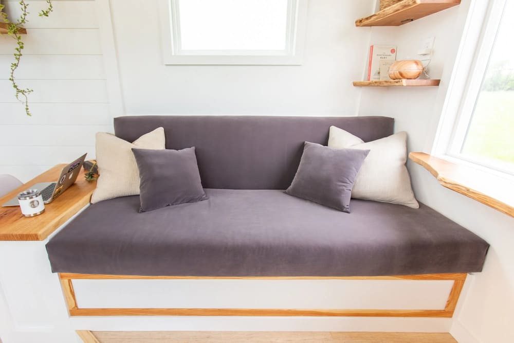 You deserve a little bit of luxury in your tiny home, and that’s what you get in the shower. The shower is a 48-inch-by-36-inch stall with a seating bench. This area and the entire bathroom enjoy optimal airflow courtesy of a vented fan. Hot water comes from a Rinnai tankless water heater tucked away in the bathroom cabinet.