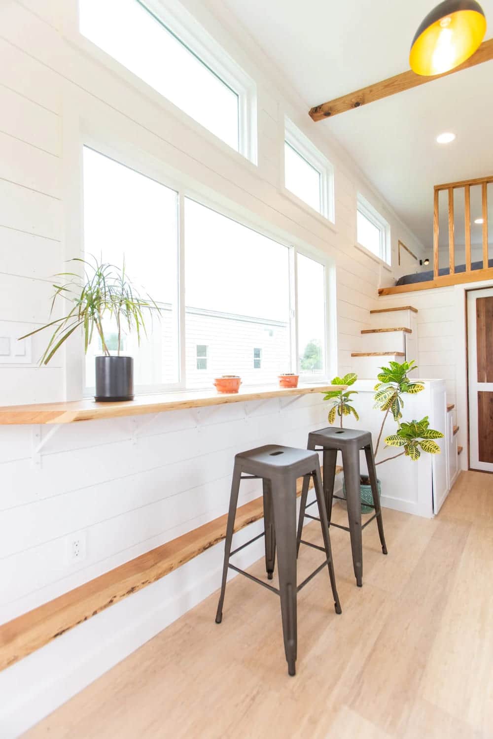 While the space is already light with the fresh white shiplap walls, the pendant lights hang above, providing focused light on the kitchen and bar.
