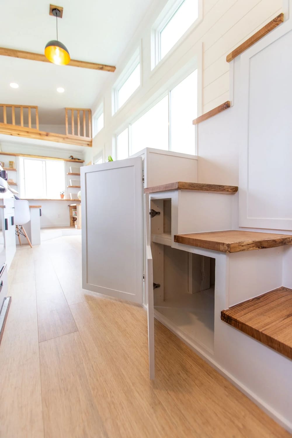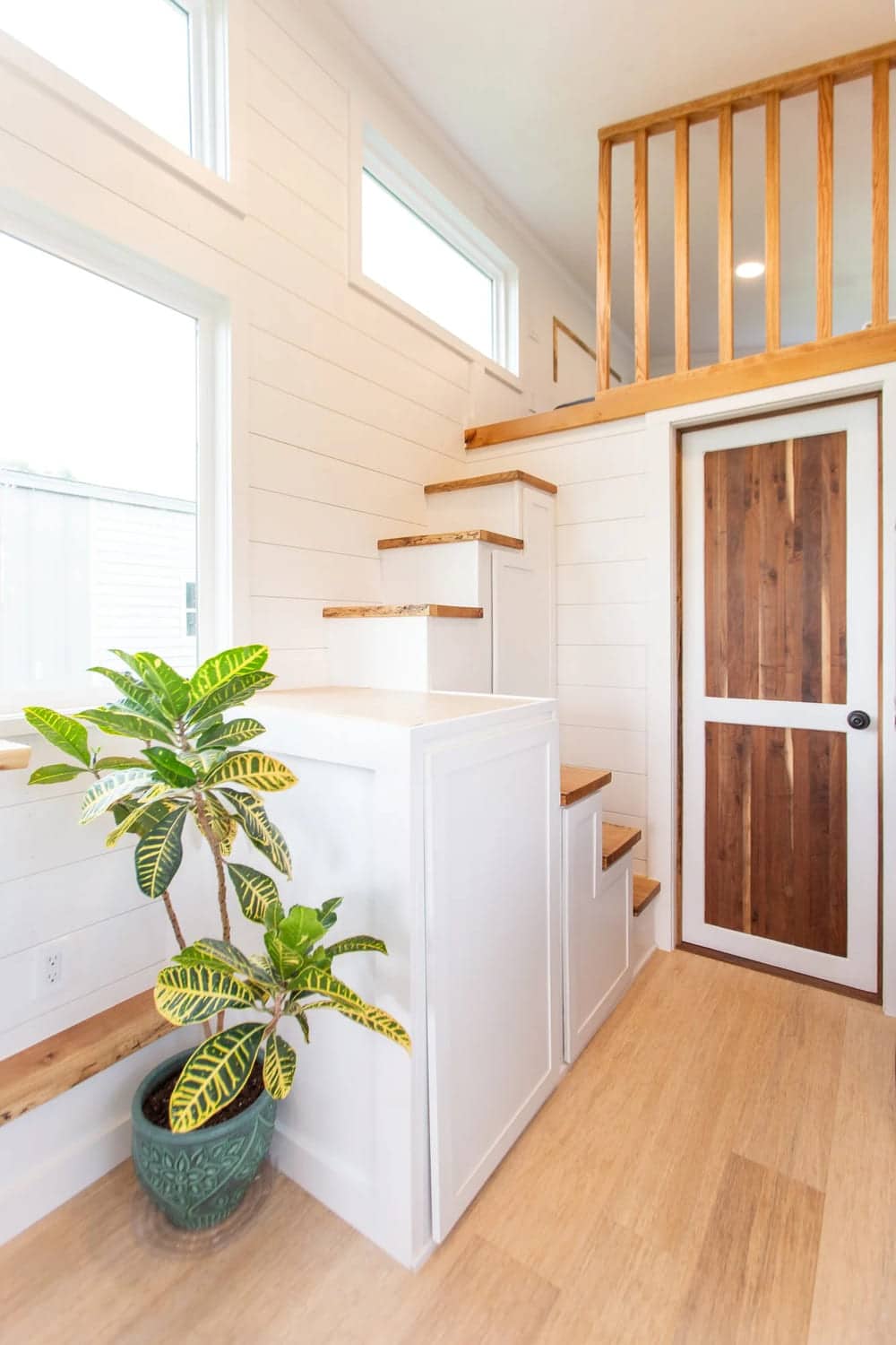 The 80 square-foot master loft is a serene, spacious, and well-equipped space for individuals and couples alike. It’s light and bright, with two awning windows. It also features easy-care vinyl plank oak flooring to pair with the fresh white walls.