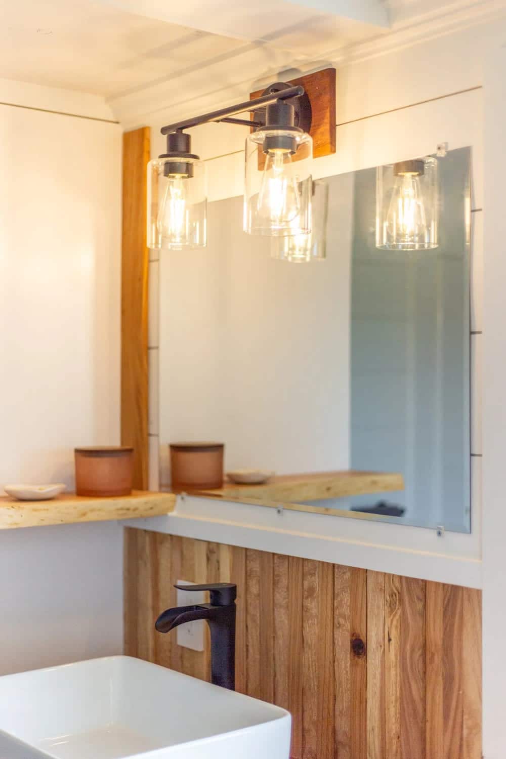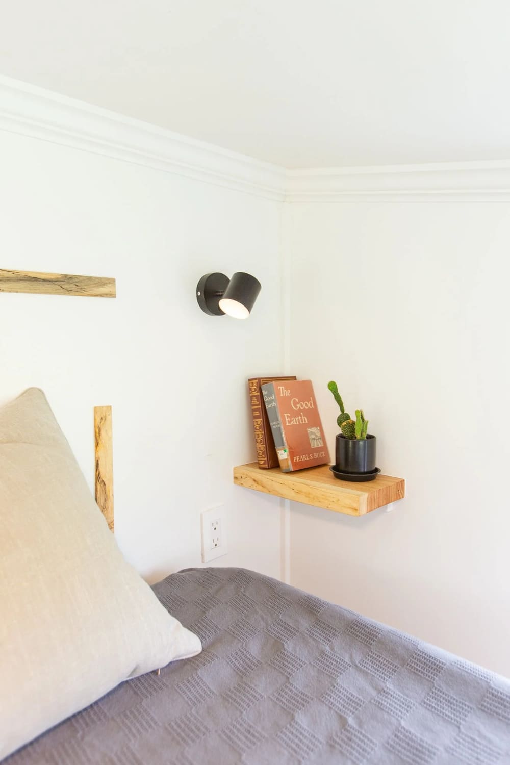 Rather than have bedside tables take up precious space, Made Relative Tiny Homes installed oak corner pieces beneath wall lighting. These shelves brilliantly tie in the oak accents with the rest of the home. When you need more than just reading light, you can switch on the dimmable overhead LED lights.