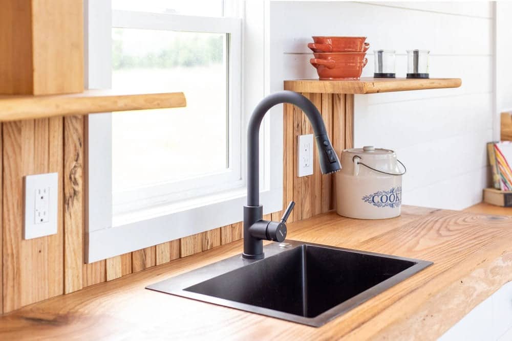 While the wood gives the kitchen a warm, cottage-like feel, the sleek black sink and pull-down faucet bring in a more modern, practical edge.