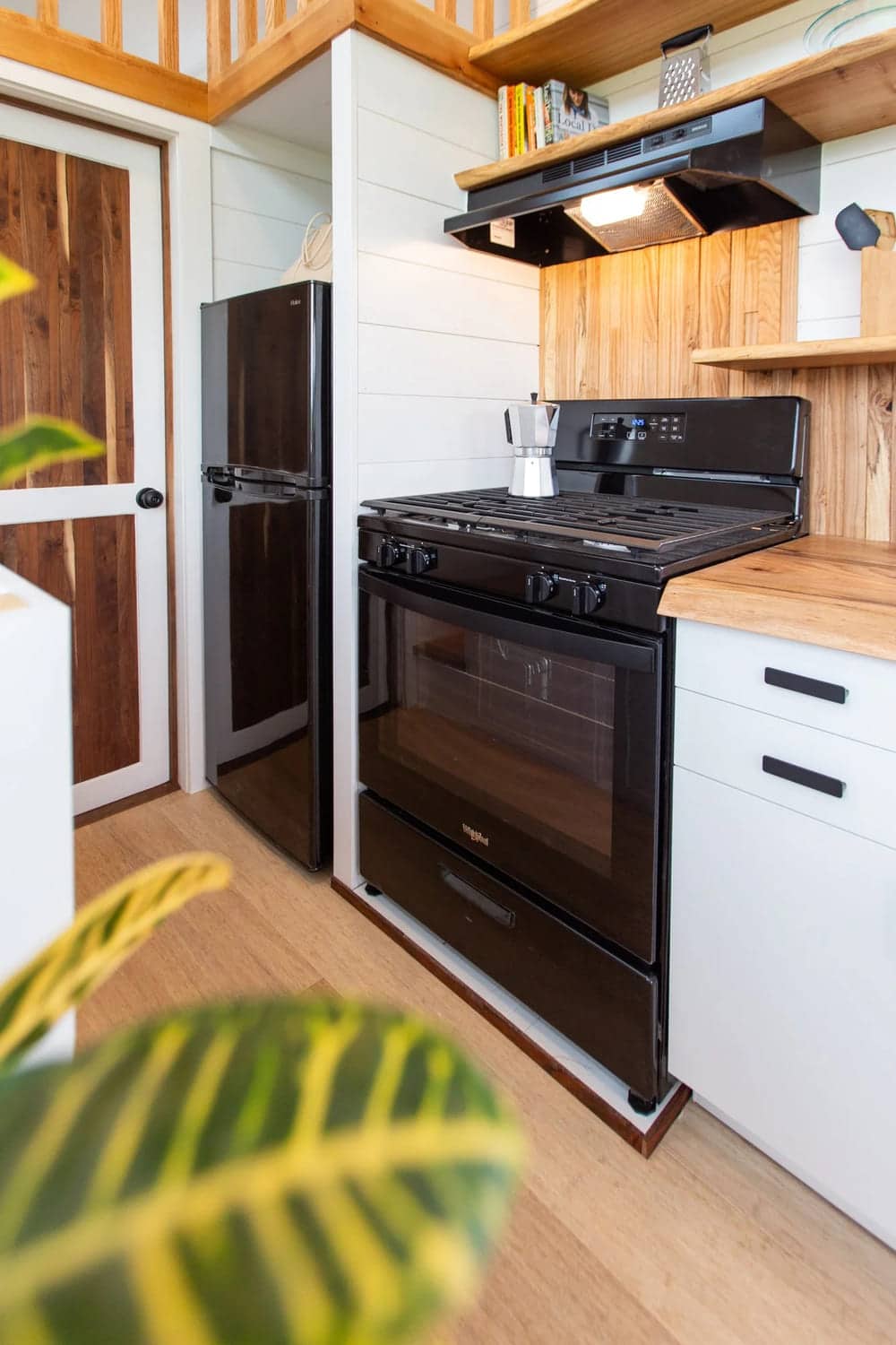 Living in a tiny home doesn’t mean scaling back on the essentials. Elderberry includes a full-size black gas range with an oven and warming drawer, along with a multi-speed ventless hood fan with built-in lighting. A matching black fridge-freezer sits alongside, keeping the setup practical and familiar.
