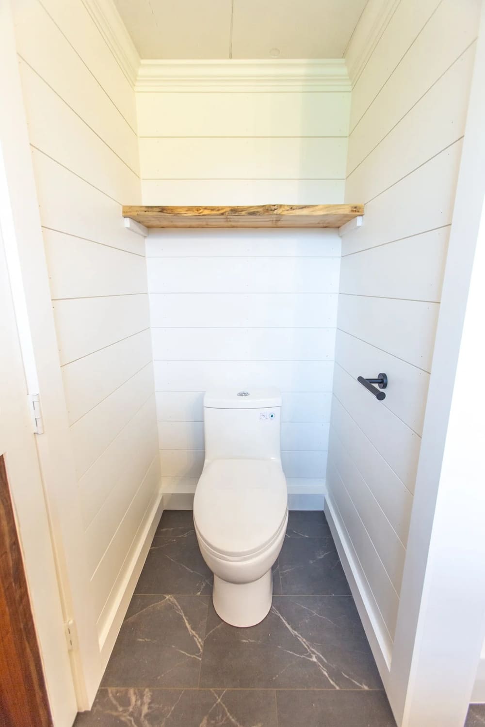 Next to the shower, tucked into its own small nook, is the toilet area. You can opt for a one-piece dual-flush toilet or install a composting toilet, depending on your setup.