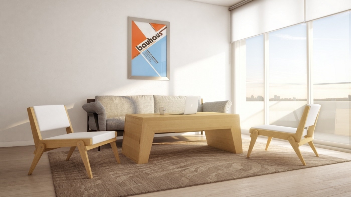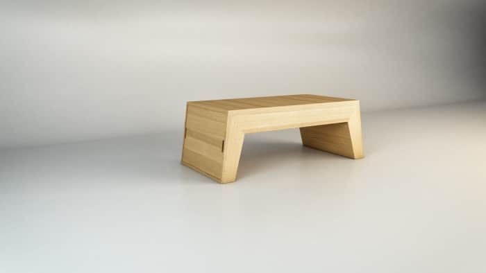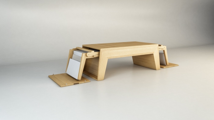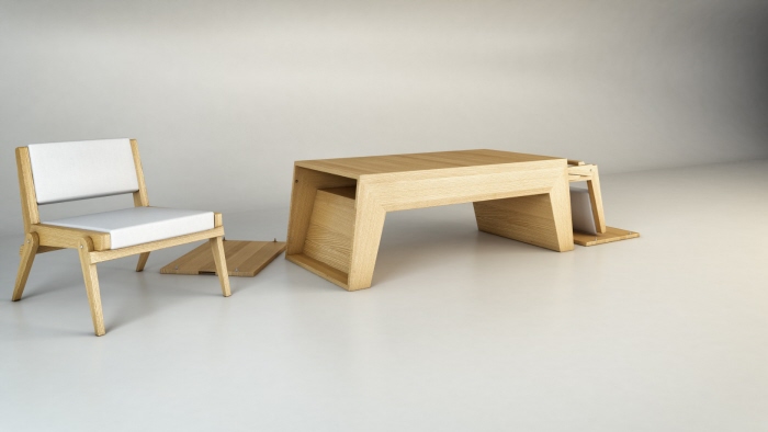 This Coffee table/lounge chairs furniture designed by Claudio Sibille consist of a hollow coffee table, from which two hidden individual lounge chairs can be extracted through the removable lateral doors of the table.