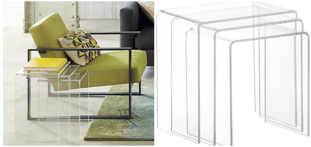 Peekaboo clear nesting tables set of 3. Now you see them. Now you don’t. These transparent surfaces float in the room without taking up permanent visual residency. Thick molded acrylic adds clean mod edge in one seamless turn. Clean plexi look works easy as 1-2-3 for living room entertaining or bedside stacks. Nest together or scatter room to room. Price: $199.00. Find them at CB2.com